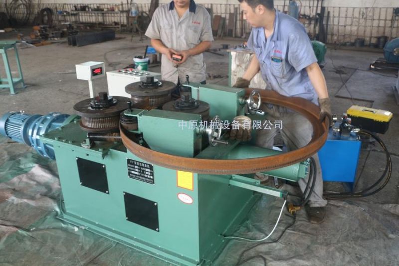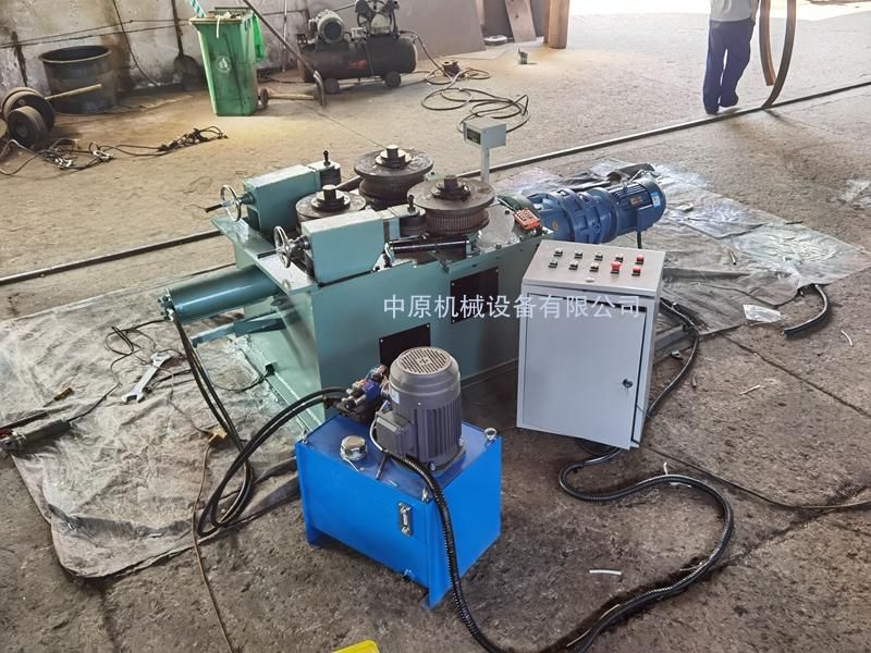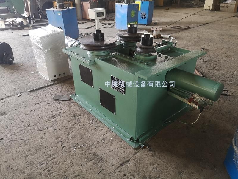 該機為叁輥型材卷圓機,集機電一體。電機輸出的較高轉速通過傳動裝置(聯軸器,減速機,齒輪等)轉換成所需的大扭矩低轉速,帶動固定位置的兩主動輥實現旋轉運動,為型材行走提供扭矩。被動輥通過油缸前進、后退實現位移,來控制直徑大小。三個工作輥成等腰三角形分布,通過調整移動輥實現這三個點形成的弧線達到所需彎曲半徑,借助被動輥的壓緊及兩主動輥的旋轉運動,使型材經過多次連續彎曲,產生永久性塑性變形,用于常溫狀態下將型材卷制成圓形,弧形等工件。