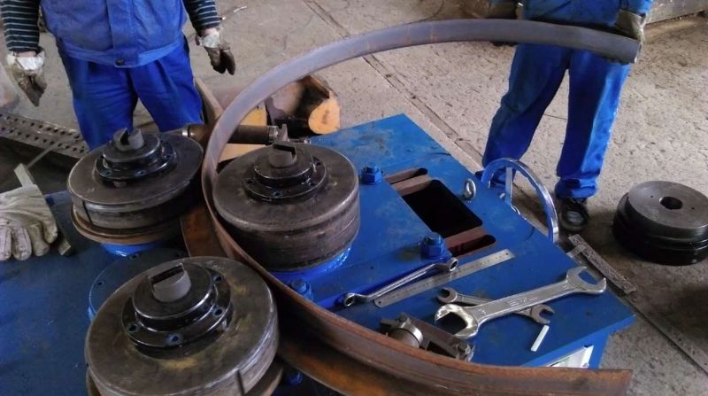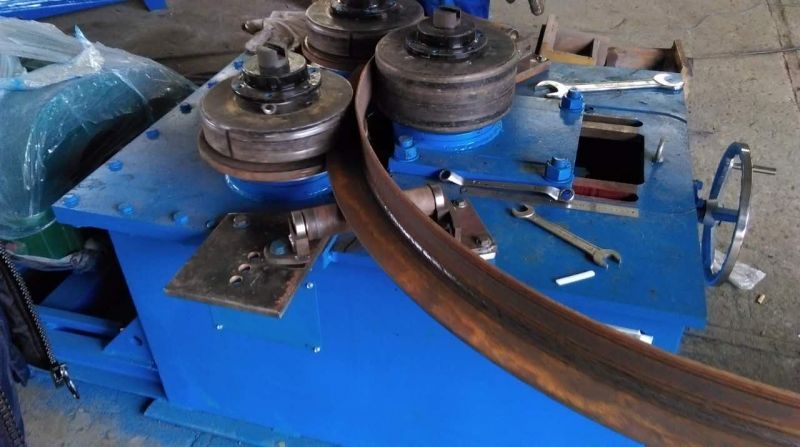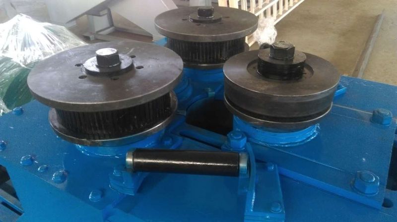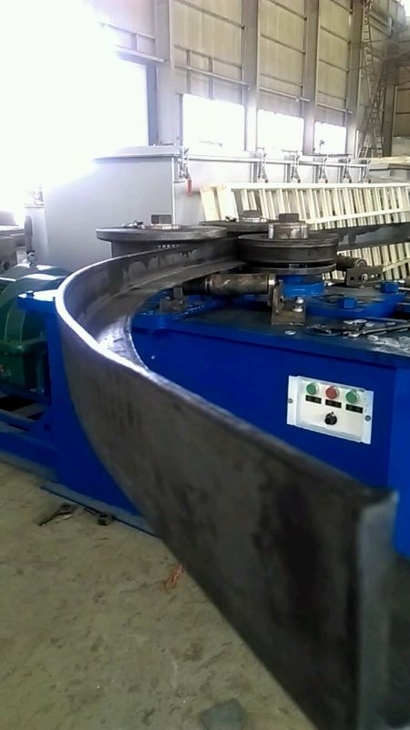 F6型卷圓機是對稱式三輥型材卷圓機,集機電一體,將電動機輸出的較高轉速通過傳動裝置、聯軸器、減速機、齒輪等轉換為所需的大轉矩低轉速,帶動位置固定的兩主動輥實現旋轉運動,為型材行走提供扭矩。被動輥通過手輪前進、后退實現位移,為卷制型材提供所需的加壓力,位移量由數字標尺實時顯示。三個工作輥成等腰三角形分布,通過移動被動輥位置實現這三個點形成的弧線達到所需彎曲半徑,即調整所彎型材的曲率。借助被動輥的壓緊及兩主動輥的旋轉運動,使型材經過多道次連續彎曲,產生永久性的塑性變形,用于常溫狀態下將型材卷制成圓形、弧形、螺旋形等工件。372378308934599585